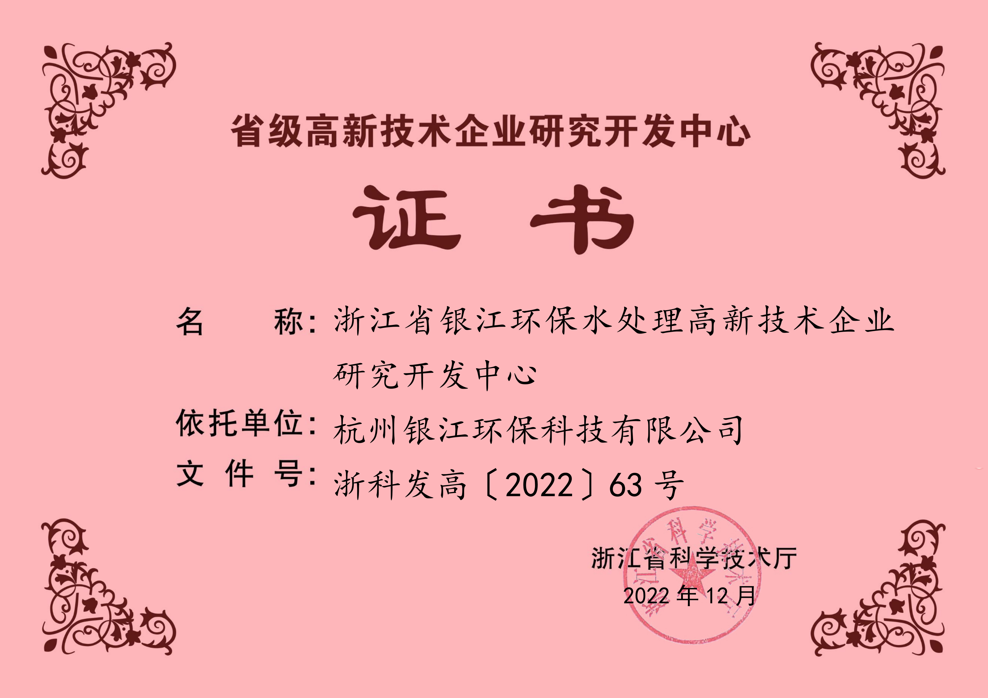 省級高新技術企業研究開發中心證書