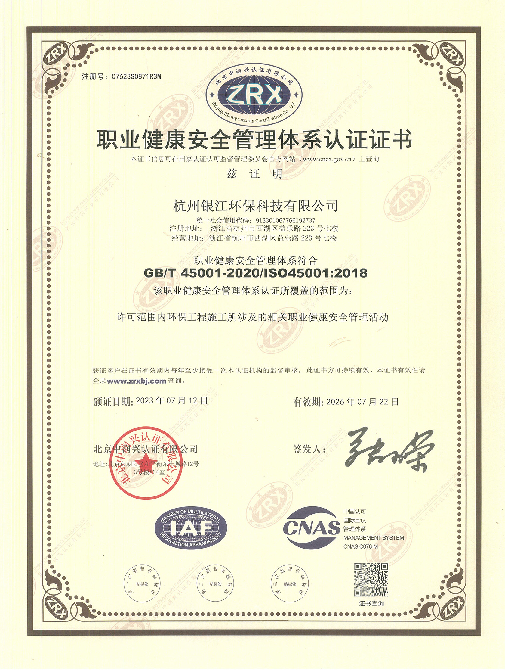 職業健康安全管理體系認證證書