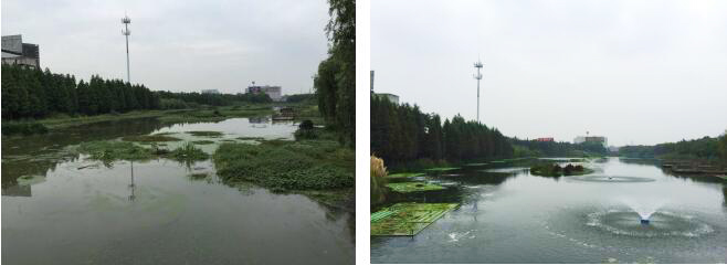 十號河位于杭州市江干區,北起余杭區界,向南流入和睦港,全長1762米,河面寬度5-100米,平均水深約2.3米,河道水體容量約10萬立方。2015年,該河道已進行了生態治理和養護工程,目前河道水體中藻類較多,水質總磷超標,屬于劣五類水,且水體顏色呈“棕綠色”,水面有大量的水綿等漂浮物,嚴重影響河道的生態景觀效果。 該項目采用了一套5000噸/天的KtLM濾膜一體機進行河道水質提升,出水達到Ⅳ類水標準。