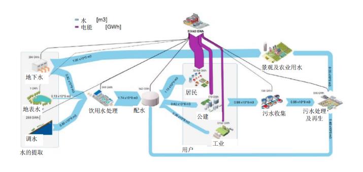 圖2所示給出了北京2015年水系統水量與能耗分配關系?;鶊D,可以評估城市“水足跡”過程及能量消耗,在城市尺度上系統評估和多目標優(yōu)化“水-能”關系,通過水系統全流程過程系統規(guī)劃、聚焦水循環(huán)每個鏈條,進行傳統工藝改進、高效設備及革新性工藝技術應用,尤其是對排水系統結構優(yōu)化進而提升系統能源利用效率,因地制宜地采用污水中資源、能量回收以及清潔能源提取和利用等技術措施,進一步降低水系統能耗和溫室氣體排放,對于提升水系統韌性及可持續(xù)至關重要。