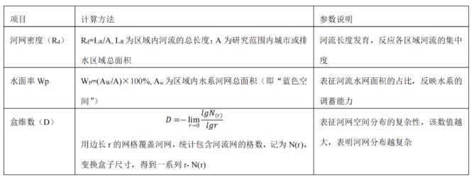 河網調蓄能力是水系在水文方面的重要功能之一,尤其在削減洪峰、降低洪水危害中具有重要的作用。受人類活動影響,尤其是近半個世紀年以來快速城鎮(zhèn)化引起的土地利用方式變化,致使許多城區(qū)河流、水塘、水淀區(qū)被掩埋甚至完全消失,導致城市水面率大幅減少,河網、水系發(fā)育及演變也表現出由復雜到簡單、由多元到單一的變化趨勢。世界范圍內60%以上的河流受到城市化的影響,而城市化對河流生態(tài)完整性及生態(tài)功能造成了嚴重威脅;從國內外經驗看,這種演變無疑還會加劇洪澇災害、水質惡化等問題。借助河道容蓄指標與水系結構參數的相關關系分析河網結構對調蓄能力的影響,常用的水系變化指標包括數量特征參數和復雜性參數,選取河網密度(Rd)、水面率(WP)描述水系的數量特征,河網盒維數描述水系的復雜性特征,各指標計算方法及內涵見表1。