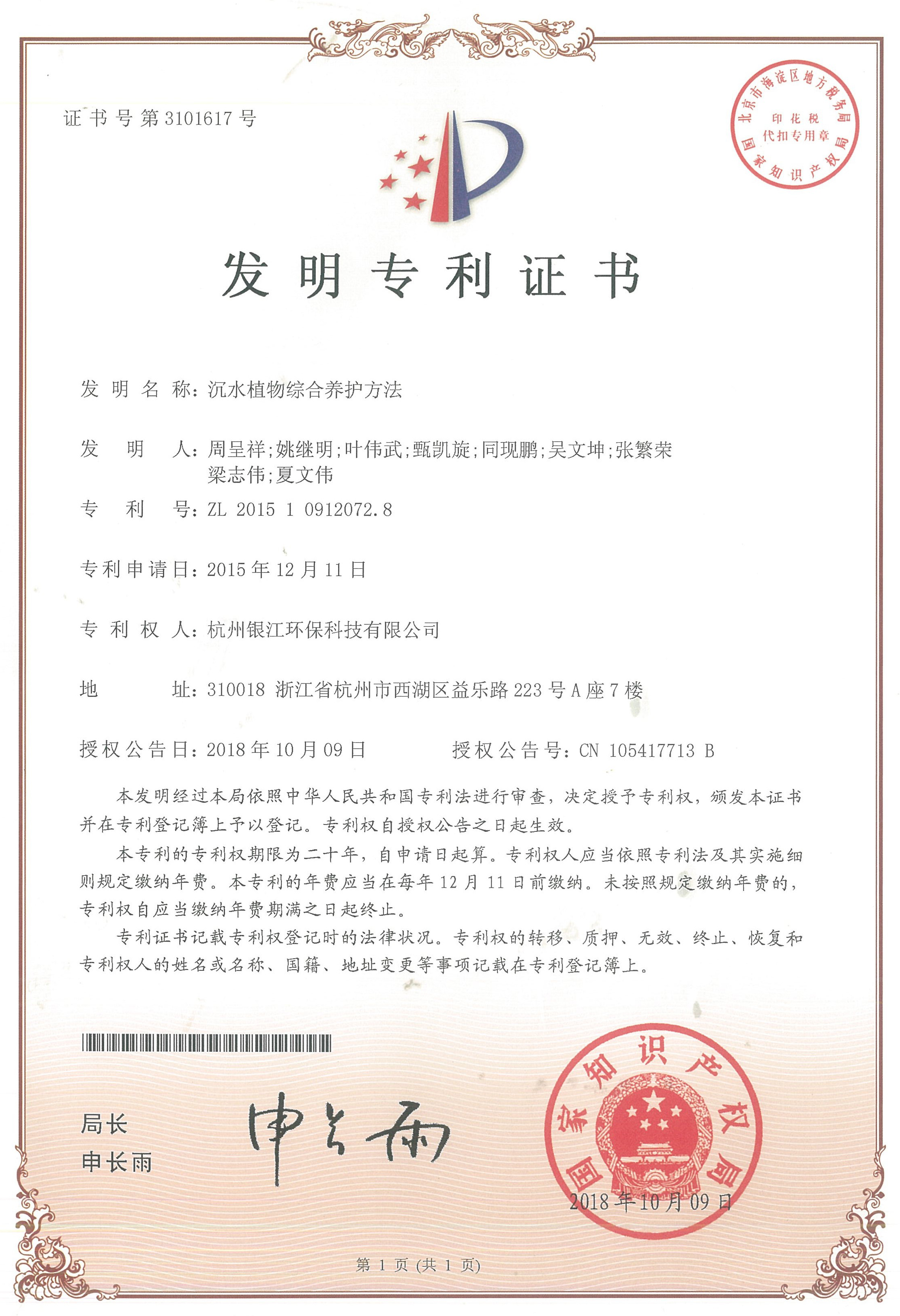 近日,杭州銀江環??萍加邢薰驹俅潍@一項發明專利:沉水植物綜合養護方法(專利號ZL 201510912072.8)。