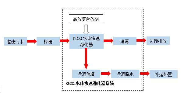 溢流污水經提升泵進入KtCQ水體快速凈化器前段的配水槽,污水流經配水槽時與高效復合藥劑混合進入攪拌反應池,反應絮體聚合為大的礬花,并利用絮體層流分流技術,形成二次絮凝反應,提高分離效率。再通過設備底部斜板沉淀進行泥水分離,同時通入微納米氣體,將水中剩余的的懸浮物或油浮出水面,從而達到雙重固液分離之目的,污水經消毒后,達標排放,污泥浮渣進入污泥槽,經污泥泵送至污泥脫水設備處理。