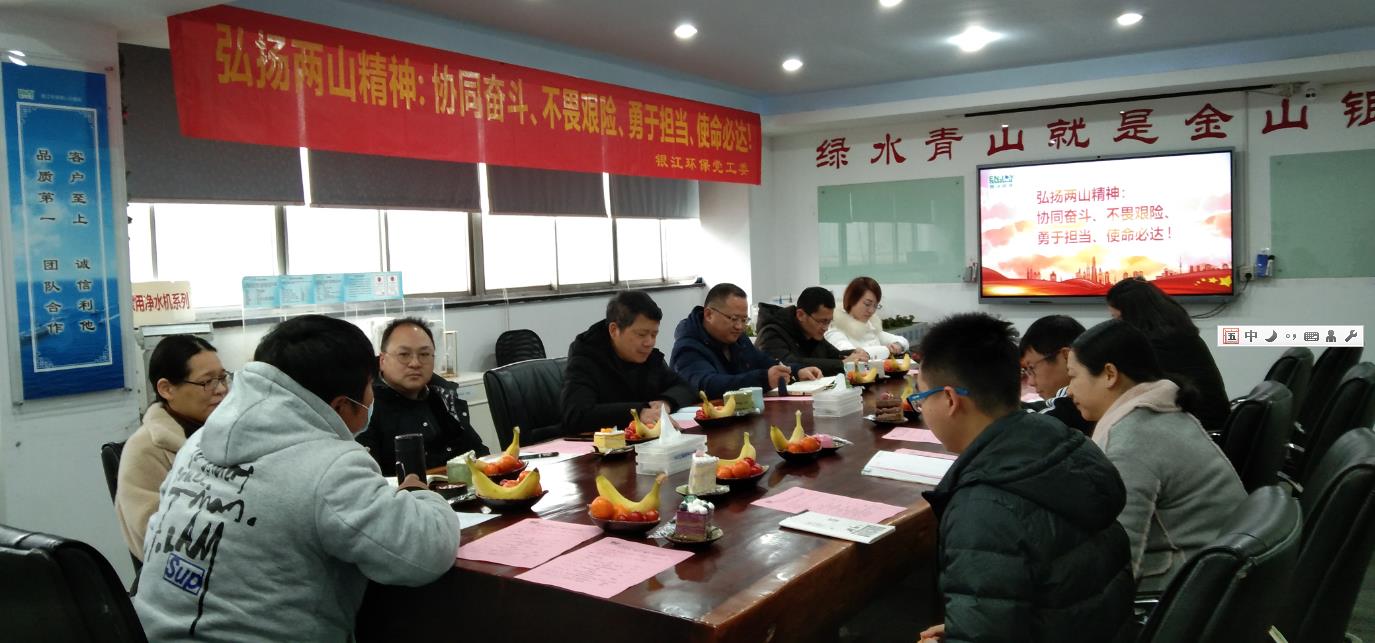 “弘揚兩山精神:協(xié)同奮斗、不畏艱險、勇于擔當、使命必達”。2021年1月24日,杭州銀江環(huán)保科技有限公司承建武漢火神山、雷神山醫(yī)院應急污水處理整套裝備一周年之際,召開了回顧“兩山”建設(shè),弘揚“兩山”精神專題茶話會。由戰(zhàn)“疫”先鋒隊員參加該會議,邀請嘉賓有西湖區(qū)古蕩街道數(shù)益商圈黨支部袁書記、時代光華培訓總監(jiān)林學勤老師、公司顧問徐老師。