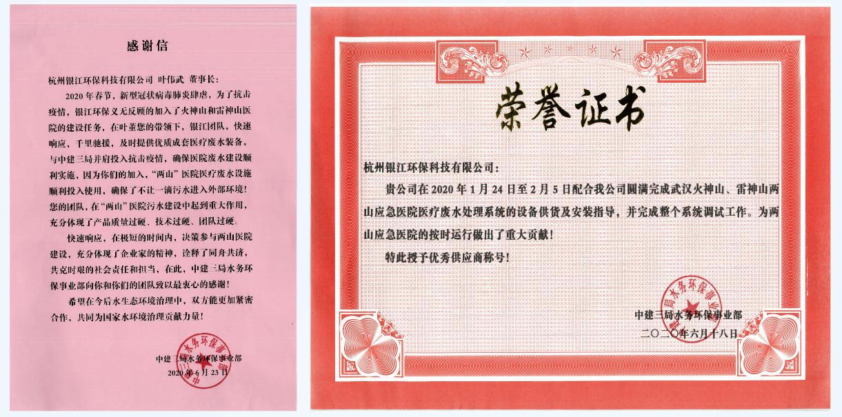 中建三局頒發(fā)給銀江環(huán)保的感謝信和榮譽證書