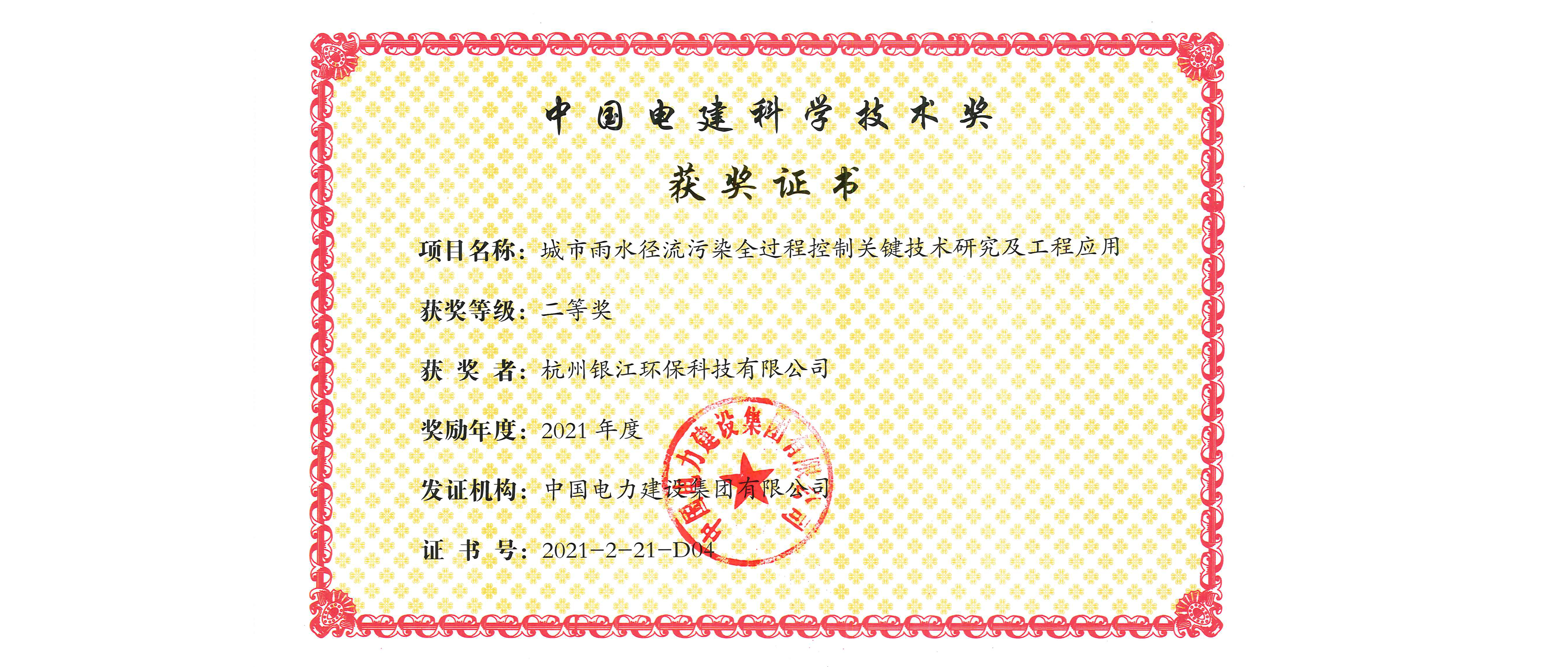 銀江環保《城市雨水徑流污染全過程控制關鍵技術研究及工程應用》獲中國電建科學技術二等獎。